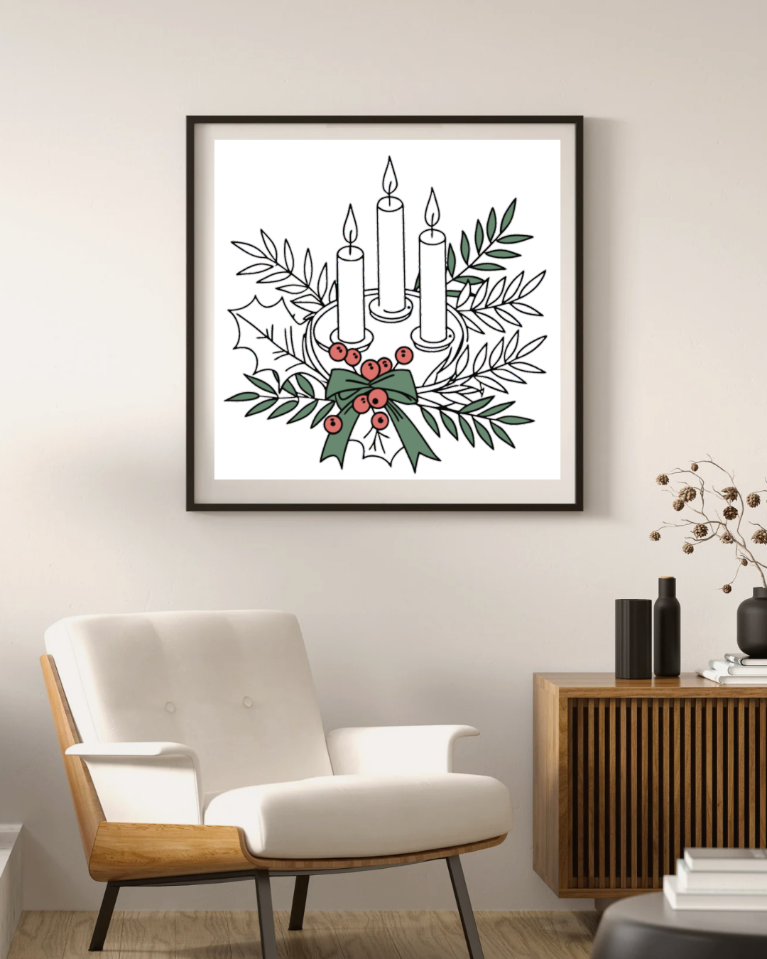 Cet art numérique est parfait pour ajouter un charme festif à vos projets de décoration, étiquettes cadeaux et impressions créatives. Les détails délicats des bougies et du feuillage apportent une atmosphère de fête et d'élégance. Utilisez cette illustration pour personnaliser vos cartes de vœux, créer des étiquettes originales ou embellir vos décorations de table.