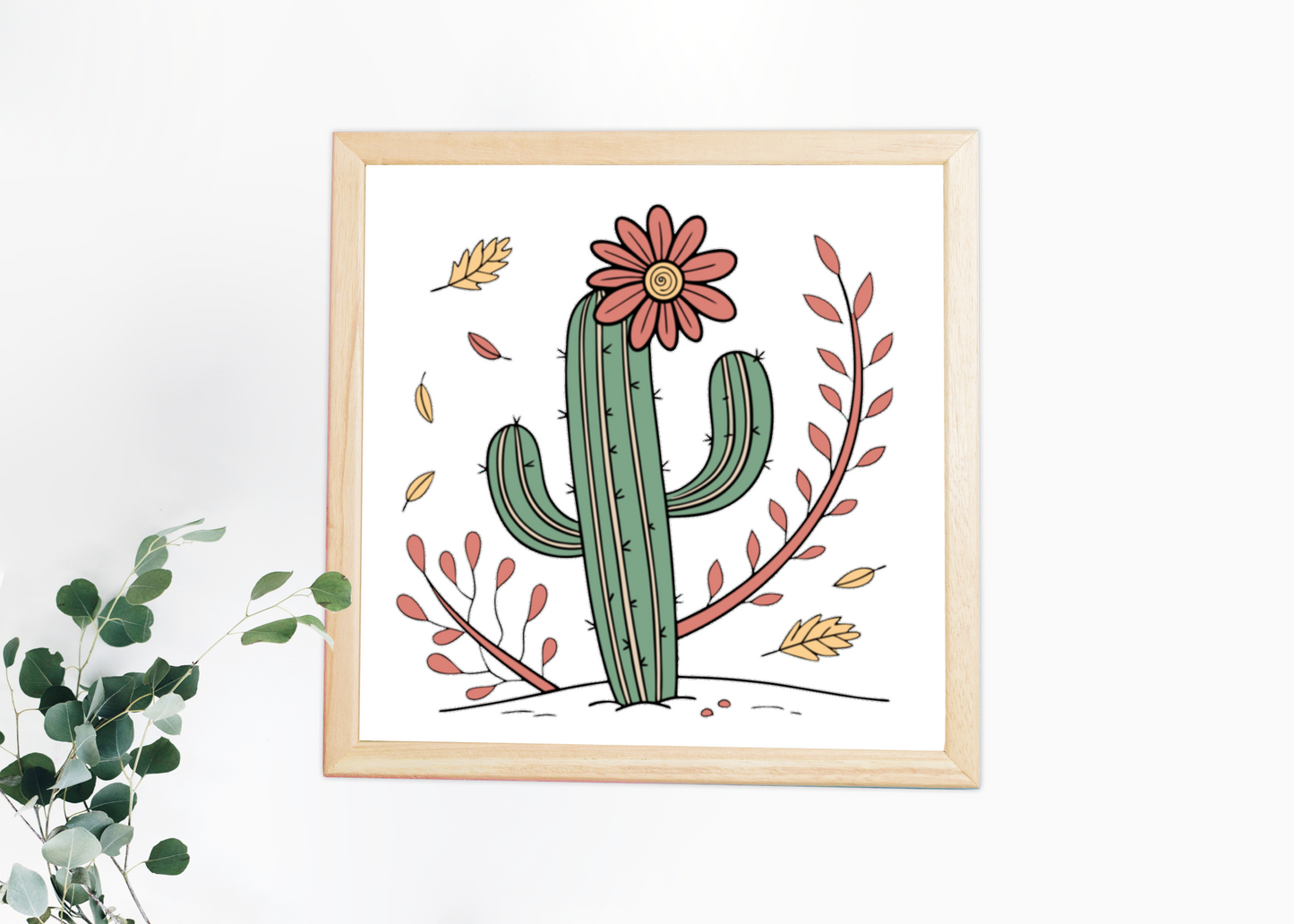 🌵 Apportez de la nature dans vos projets créatifs avec notre illustration de cactus fleuri entouré de feuilles d'automne.