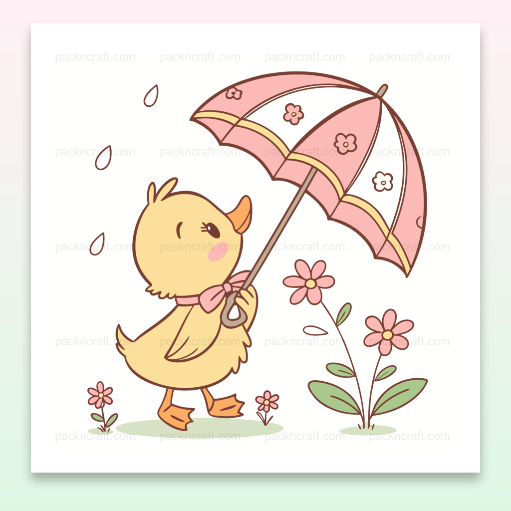 Cet adorable caneton, protégé par son parapluie fleuri, incarne la joie du printemps et s'invite dans votre quotidien avec une illustration vectorielle pastel douce. Utilisez-le pour des projets DIY, des décorations de papeterie ou même des affiches éducatives. Idéal pour les enfants et les amateurs de design kawaii !