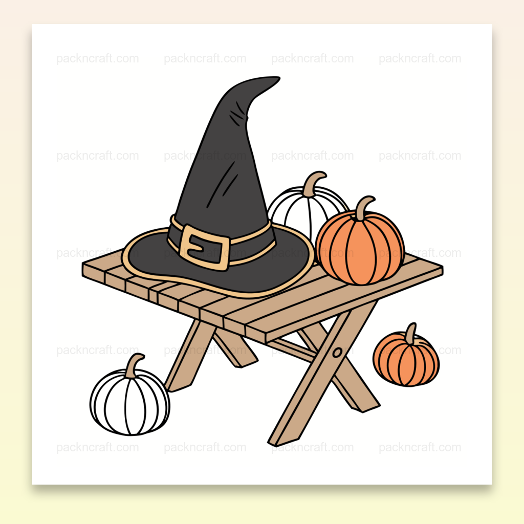 Découvrez ce fichier numérique unique représentant un chapeau de sorcière posé sur une table avec des citrouilles, parfait pour ajouter une touche ensorcelante à vos projets créatifs. Ce design vectoriel est idéal pour des utilisations variées telles que des stickers, des cartes de vœux, ou encore des affiches de décoration sur le thème d'Halloween. Téléchargez-le et transformez vos idées en réalité grâce à une qualité d'image exceptionnelle.