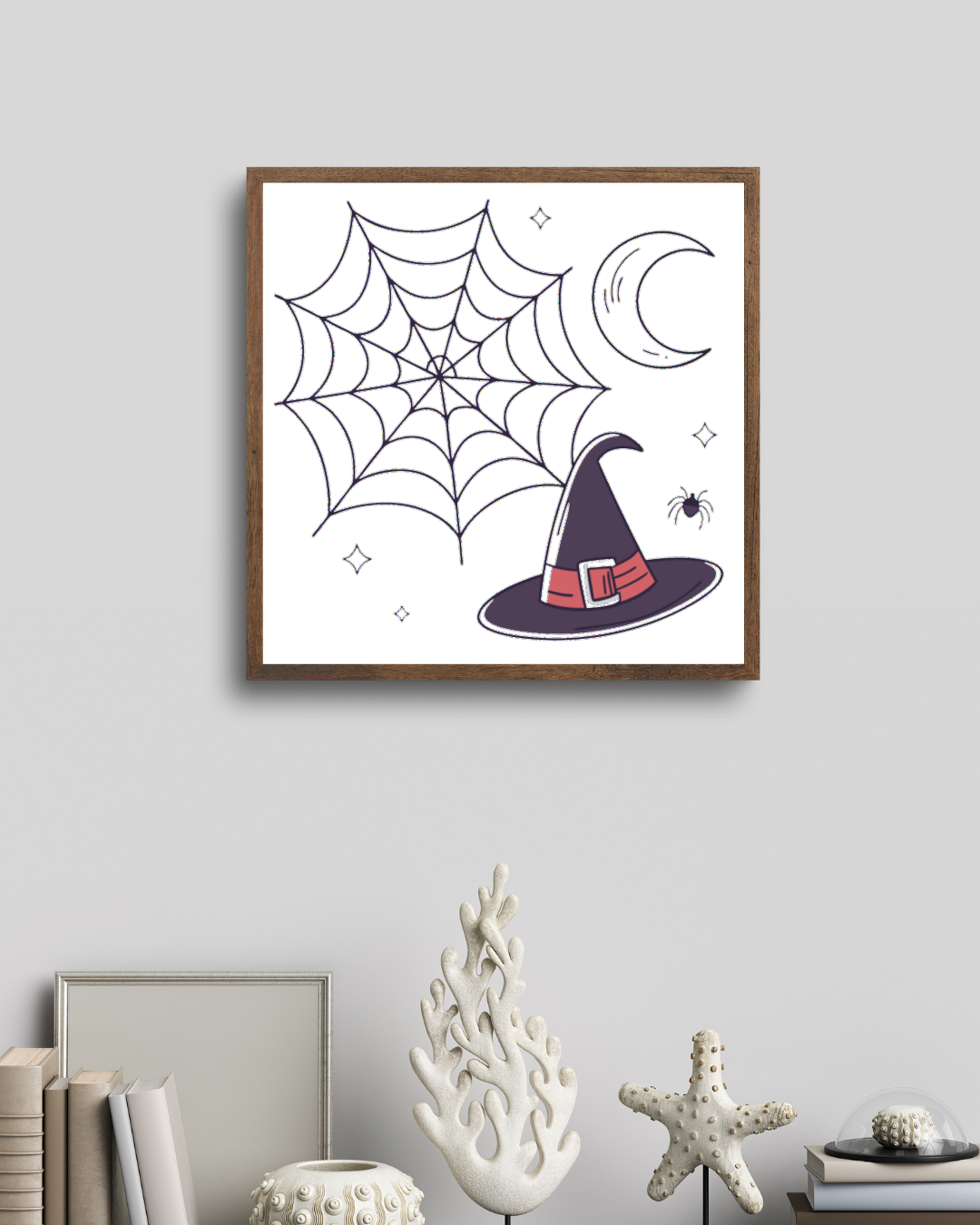 Datez vos projets estivaux d'une touche fantasmagorique avec notre illustration vectorielle, idéale pour les amateurs de décoration créative. Ce visuel présente un mystérieux chapeau de sorcière accompagné d'une toile d'araignée et d'une lune croissante, le tout dans un monde de magie et de mystère.