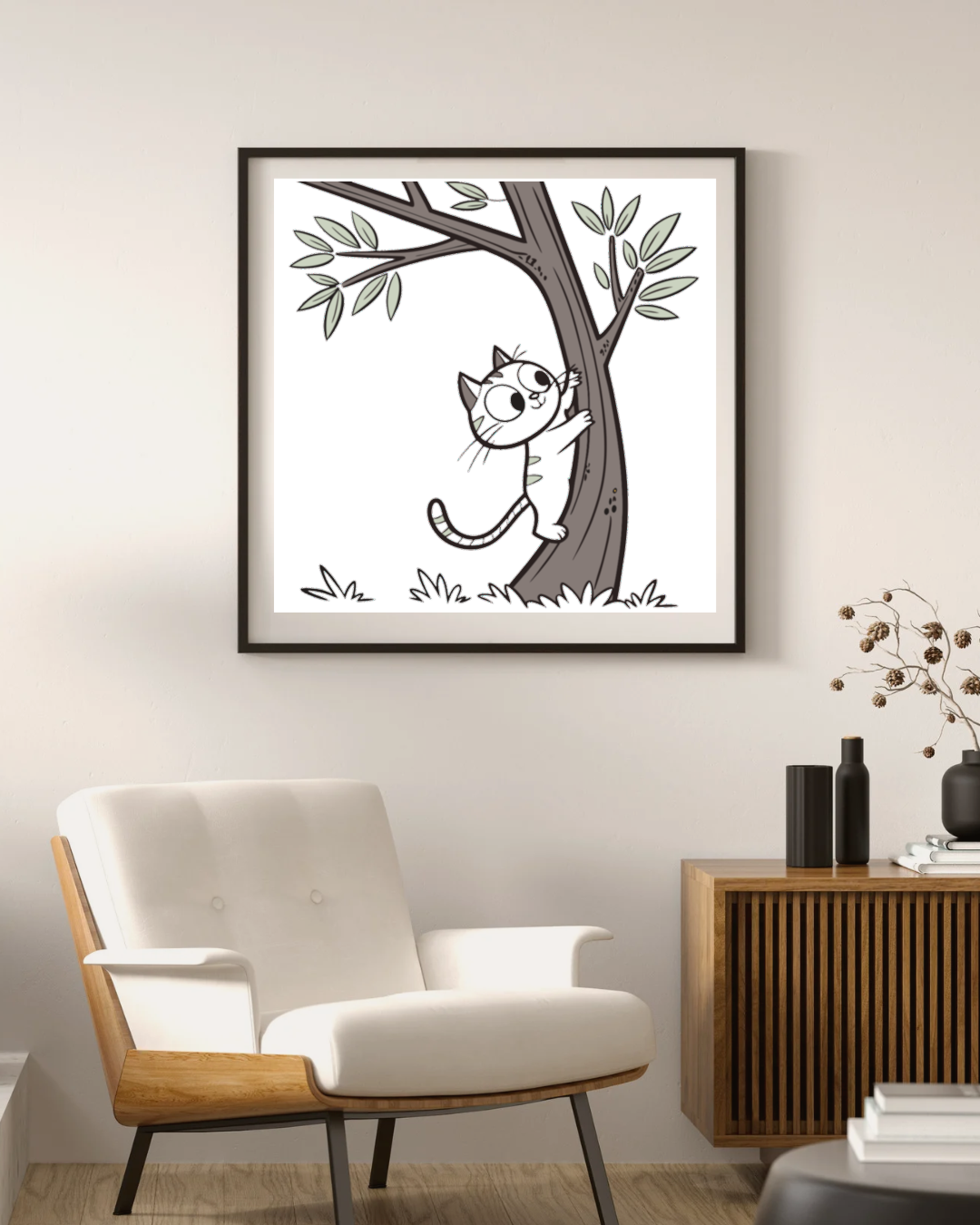 Découvrez un petit chat curieux gravissant un arbre dans un style minimaliste enchanteur ! 😻