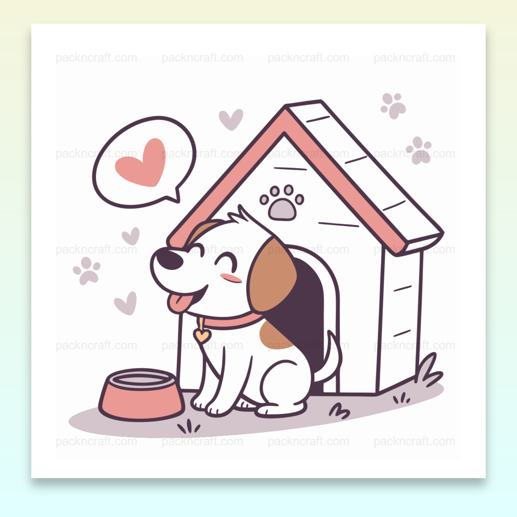 Ce design illustratif met en scène un chien heureux blotti devant sa niche, exprimant la joie et l'affection à travers une icône de cœur. Parfait pour des projets créatifs, ce fichier numérique au style kawaii peut être utilisé pour des stickers, des affiches ou toute papeterie éducative et décorative.