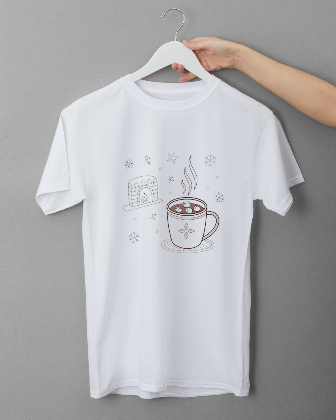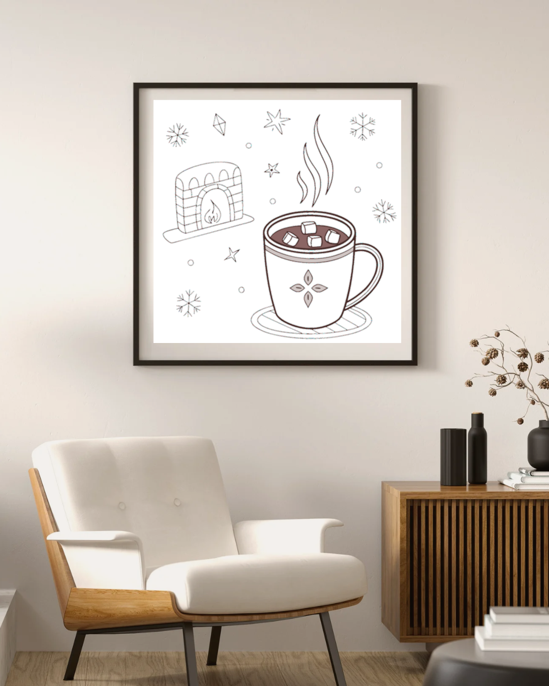 Ce visuel de chocolat chaud fumant près d'une cheminée créera une ambiance cosy et chaleureuse dans vos décors, papeteries ou projets éducatifs.