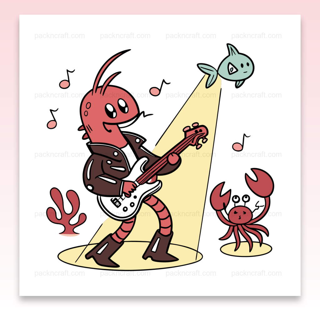Plongez dans l’univers captivant de cette crevette rock star jouant de la guitare électrique, entourée de sons maritimes animés. Idéal pour donner une touche musicale et originale à vos projets créatifs tels que stickers, papeterie, ou affiches. Ce fichier numérique permet une grande créativité avec ses designs vectoriels de haute qualité.
