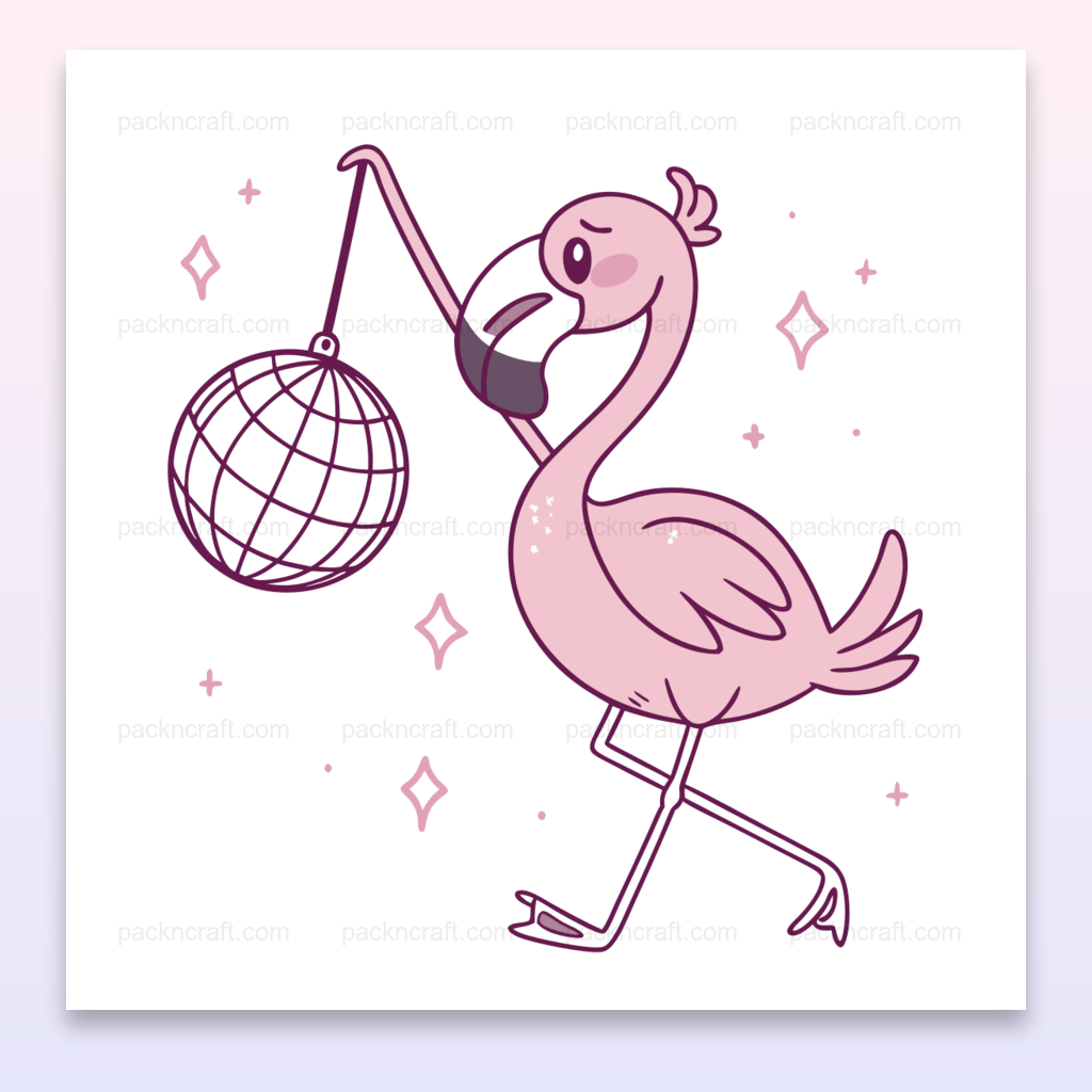 Découvrez une illustration unique capturant un flamant en pleine danse festive avec une boule disco étincelante. Ce design pastel vectoriel ajoute une touche de gaieté et de modernité à vos créations. Utilisez-le sur des stickers, des affiches ou des projets DIY et apportez une pointe de fun à votre environnement quotidien.