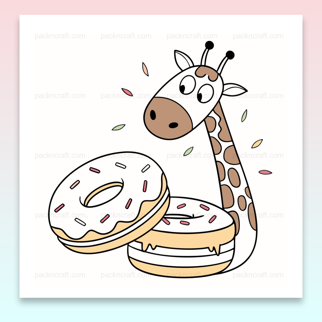 Ajoutez une touche de fantaisie à vos créations avec cette girafe curieuse observant des donuts appétissants. Ce fichier numérique est parfait pour les projets de stickers, la papeterie ou des activités éducatives. Avec son style SVG détaillé, l'image garantit une qualité optimale pour toutes vos idées de bricolage.