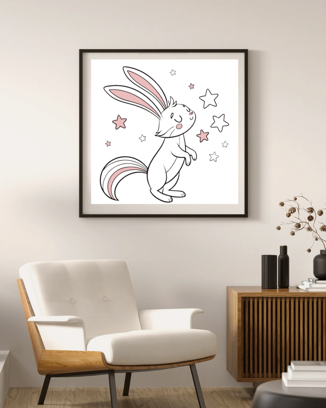 ✨ Découvrez notre adorable illustration d'un lapin rêveur parmi les étoiles, idéale pour créer une atmosphère douce et magique.