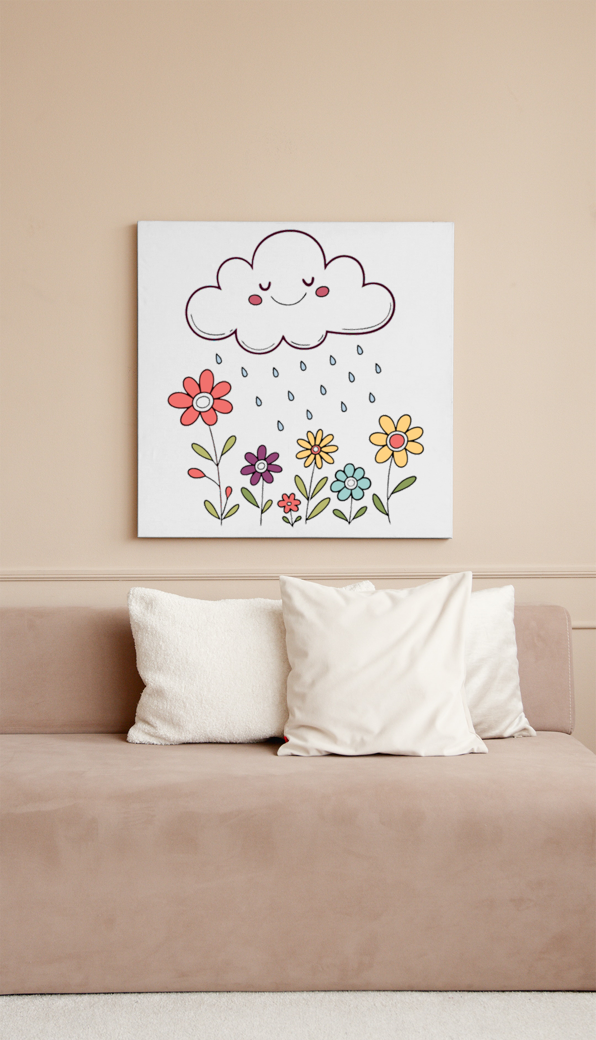 Transformez vos réalisations DIY avec notre illustration numérique aux couleurs pastel qui égayera toutes vos créations. Ce design vectoriel présente un nuage souriant arrosant des fleurs colorées, idéal pour des utilisations variées telles que des stickers, projet éducatif ou décoration intérieure.