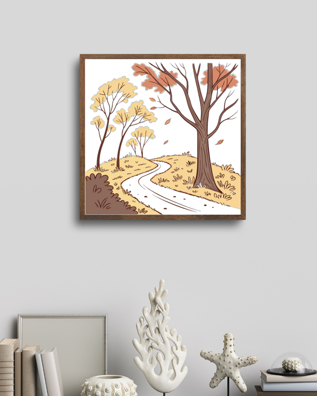 🌿 Découvrez un chemin enchanteur bordé d'arbres aux couleurs automnales. Capturez la magie de l'automne avec cette illustration unique.